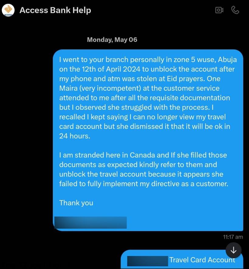 “All this while, we had been communicating via WhatsApp. Only for the bank to say I would have to wait until I return to Nigeria before I can unblock the account. This means I’m stranded in Canada regarding that account until I come back to Nigeria!”