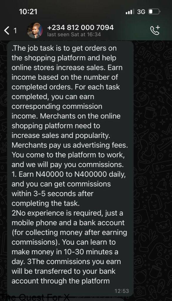 The advertiser introduced herself as Cecilia Laura, convincing the victim in WhatsApp chats that the online advertising tasks were linked with Jumia.
